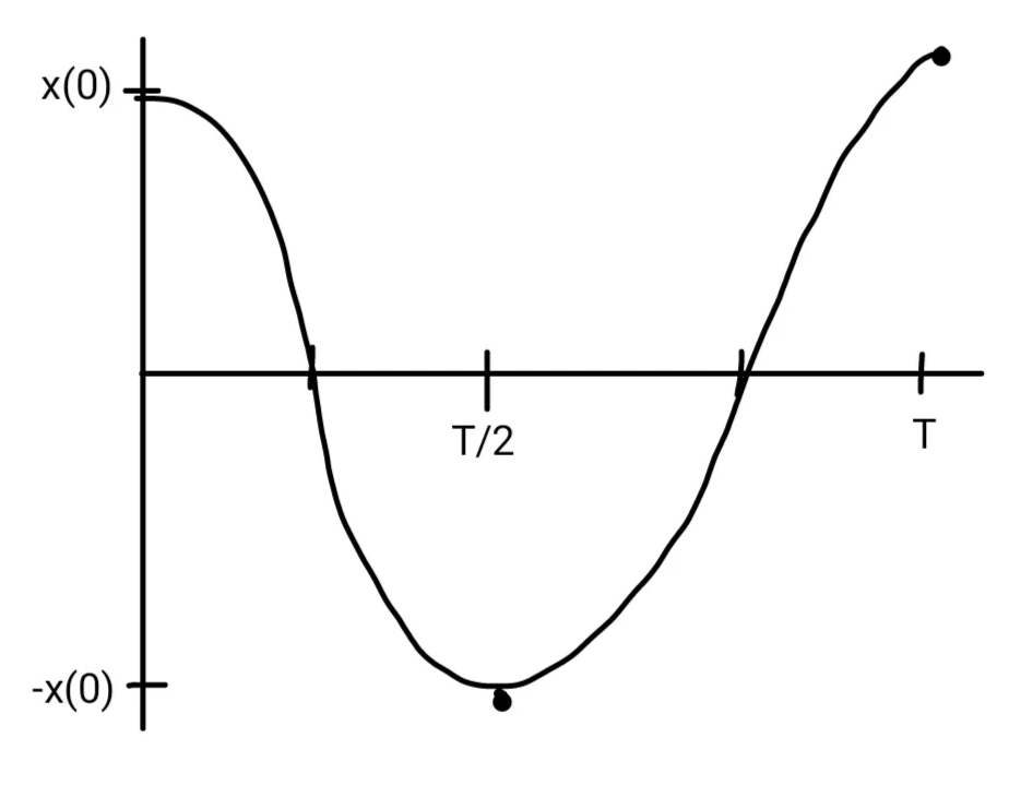 The roots occur at \(t = T/4\) or \(3T/4\), when \(x = 0\) and the spring is no longer stretched. All potential energy has been converted to kinetic energy!