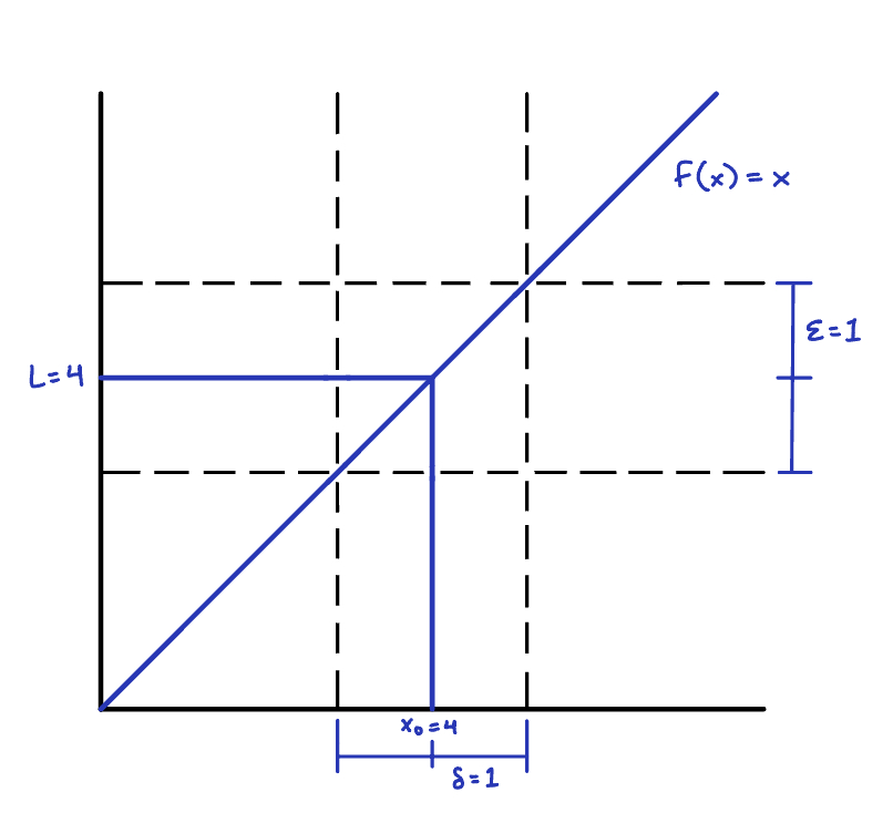 Based on this plot, if \(\epsilon = 1\), \(3 < f < 5\) if \(3 < x < 5\) (i.e., \(\delta = 1\)). For a general \(\epsilon\), \(4 - \epsilon < f < 4 + \epsilon\) if \(4 - \delta < x < 4 + \delta\) or equivalently, \(|x-4| < \epsilon\). We hence identify \(\delta = \epsilon\) and have proven that