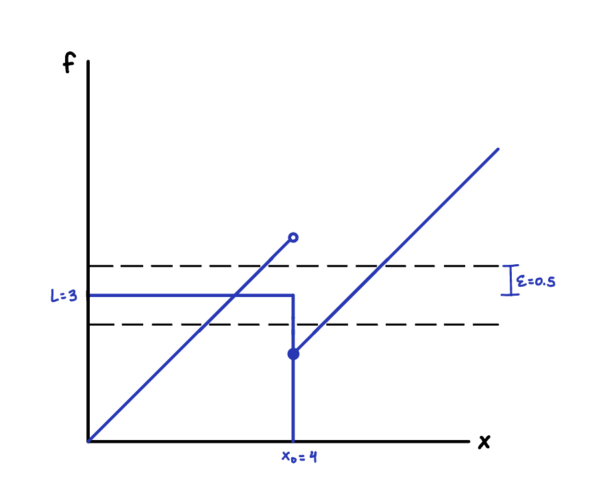 exist? If \epsilon = 0.5, there is no \(\delta\) that contains f around \(x_0 = 4\). Therefore, this limit does not exsit