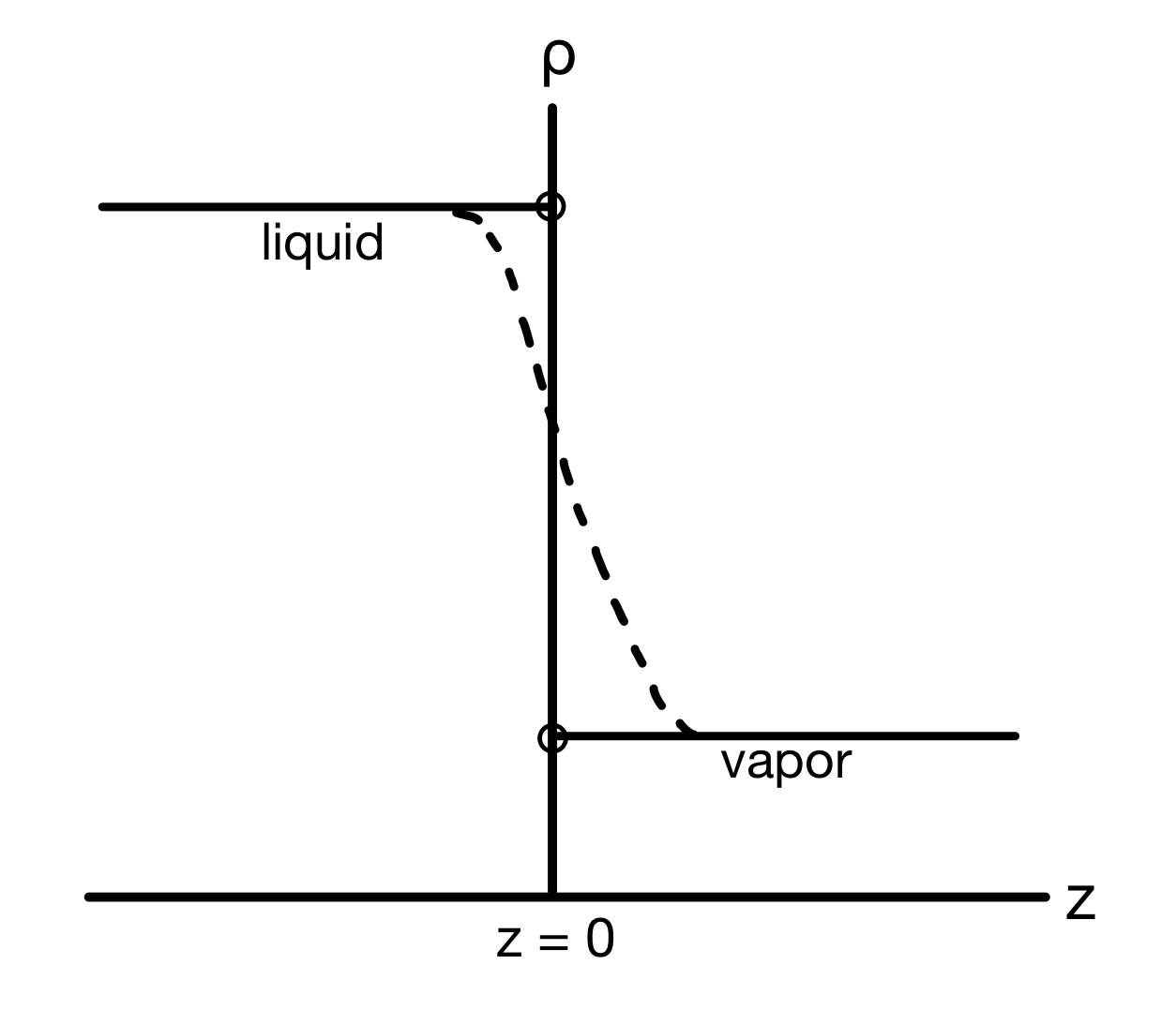 If the density as a function of distance from the interface is \(\rho(z)\), the liquid density can be denoted as \(\lim_{z \to 0^-} \rho(z)\), while the vapor density can be denoted as \(\lim_{z \to 0^+} \rho(z)\).