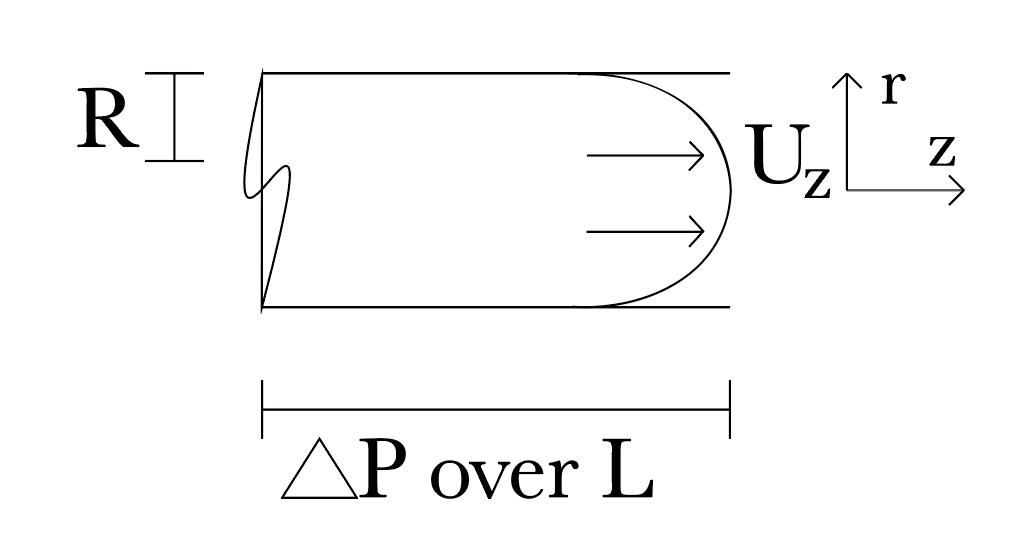 where \(u_z\) is the velocity along the pipe axis, \(\Delta P\) is the difference between the pressure at the inlet and at the outlet, L is the length of the pipe, and \(\mu\) is the dynamic viscosity.